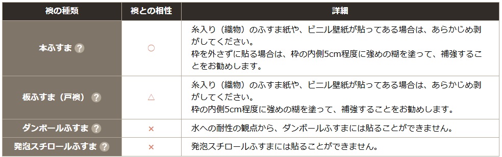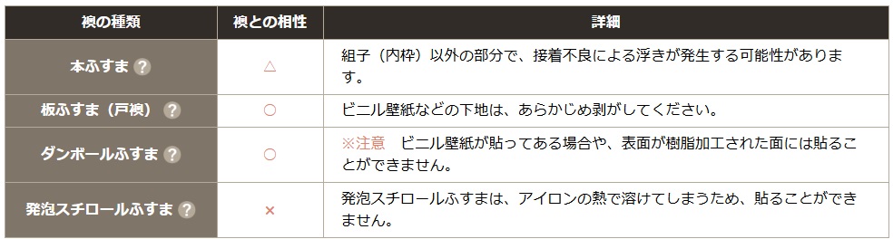 パンフレットによると、アイロン貼りは古いふすま紙が「和紙」「糸入り」「ベニヤ板」の場合剥がさずにそのまま貼れるということなのでこれに決定。