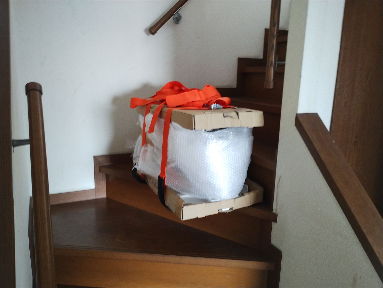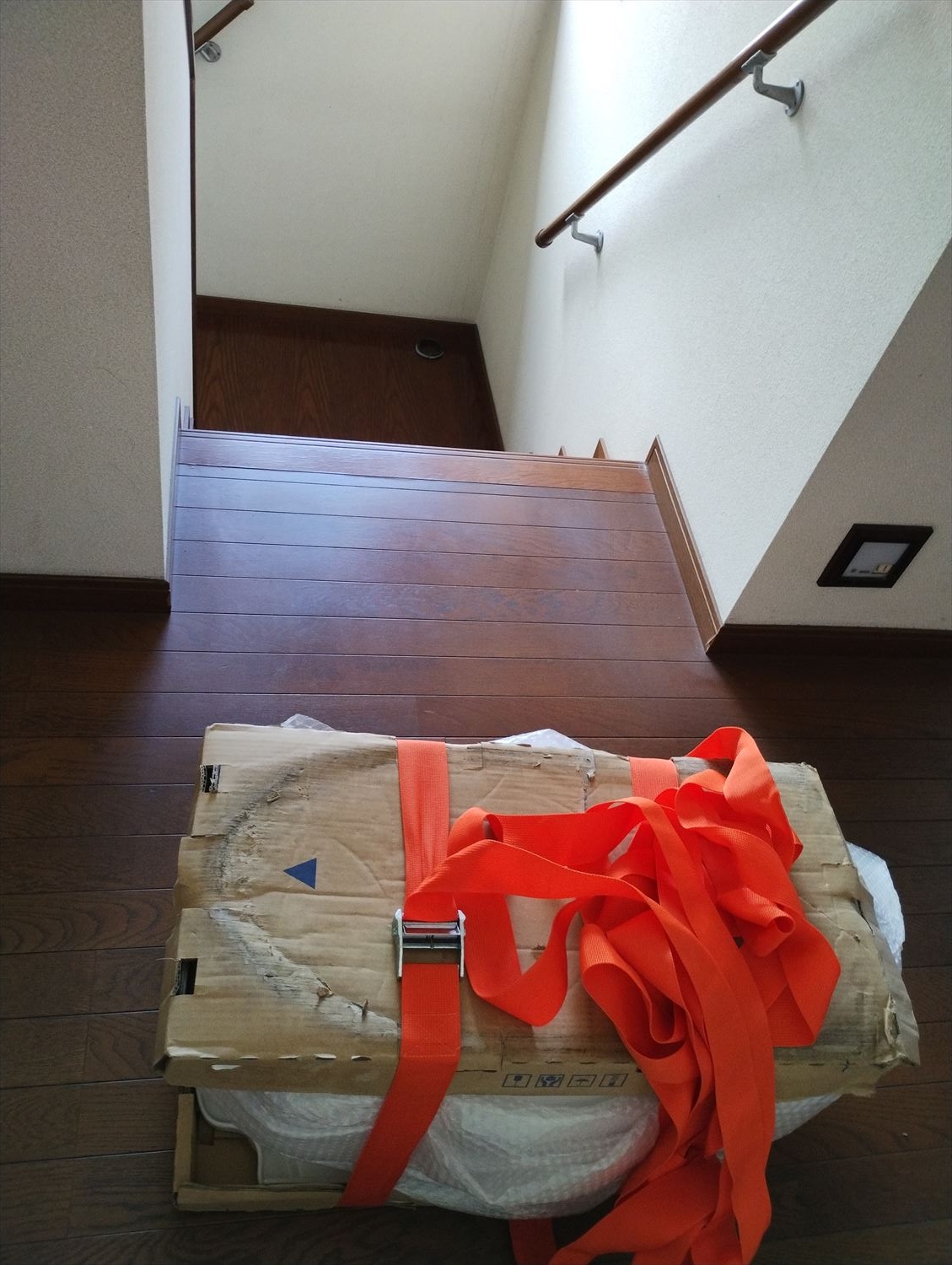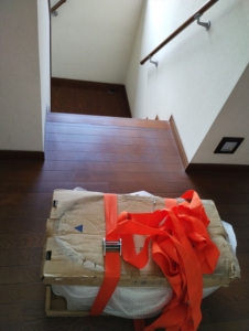 結局ロープを掛け、階段を1段ずつ持ち上げて運びました。