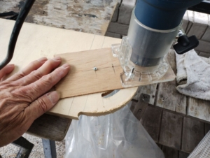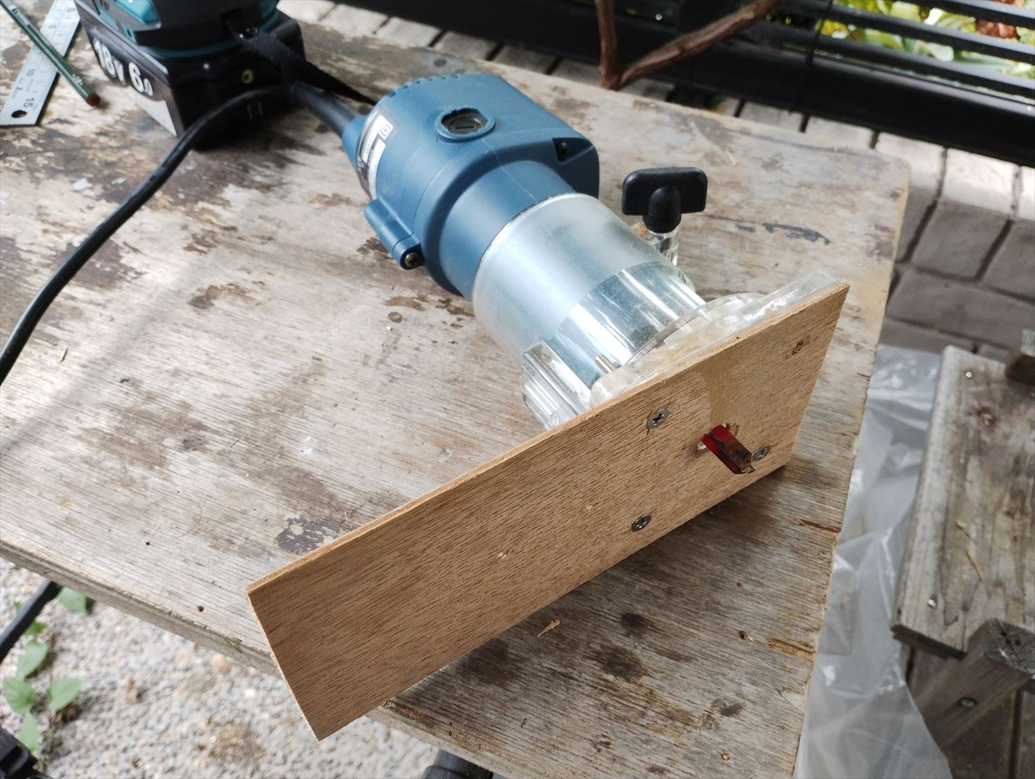 まずマイターゲージを作るため、トリマーに取り付けるジグを作ります。