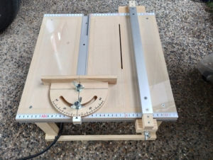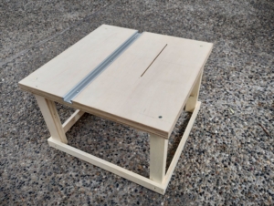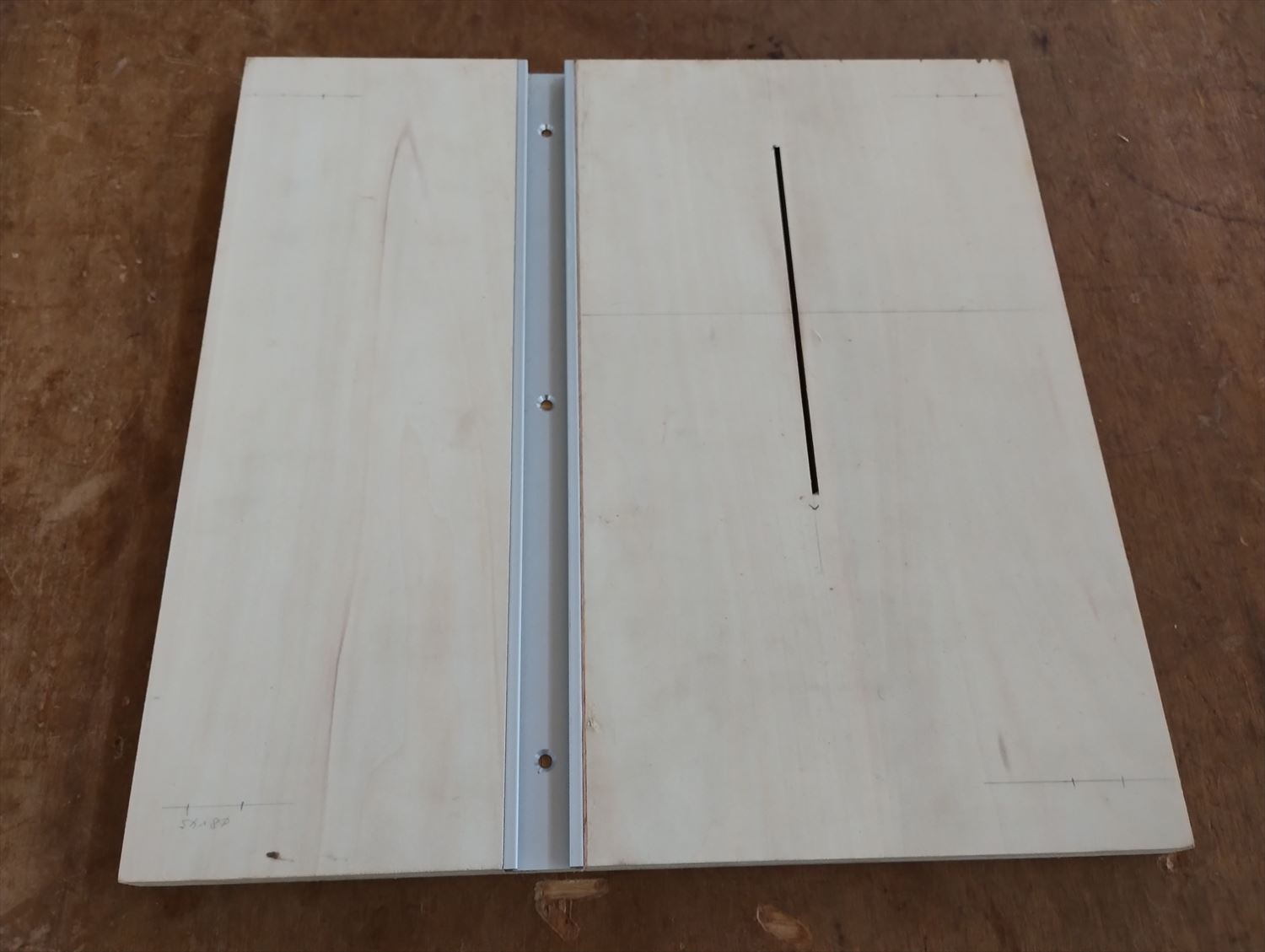 テーブルは合板2枚重ねとし、上の合板にマイタートラックをはさみ入れます。