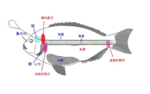 図は魚の構造と神経〆具を通す場所を緑の線で表しています。(Amazonより)