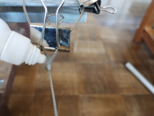 端を折り返してつなぎたい部分のワイヤーをこじ開け、フラックスをたっぷり塗ります。