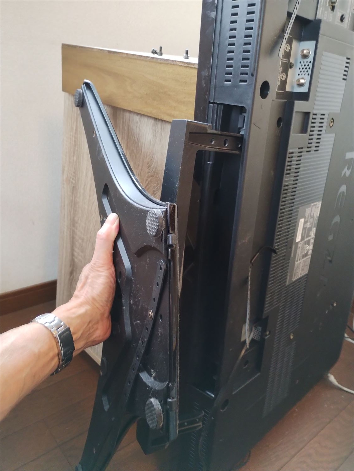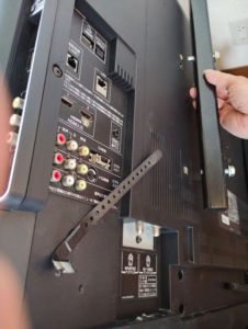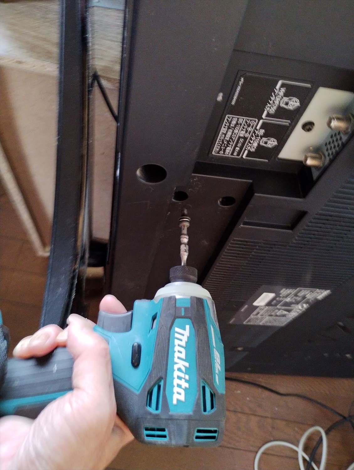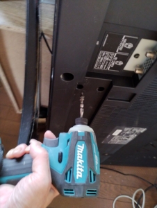棒をTV背面の壁掛け用の取付穴を利用し取り付けます。