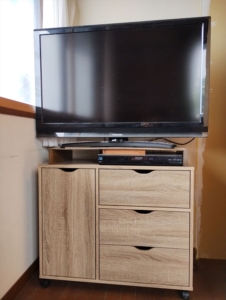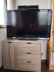新しくキャビネットを買ってBDレコーダーとその上にTVをおいたら、高くなってしまいました。