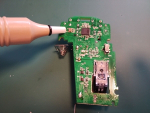それでも取れない場合は、ニッパーでスイッチを壊して脚だけにし、再度はんだごてを当て引き抜きます。