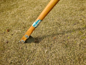 早速固くなった芝生面に振り下ろしてみました。