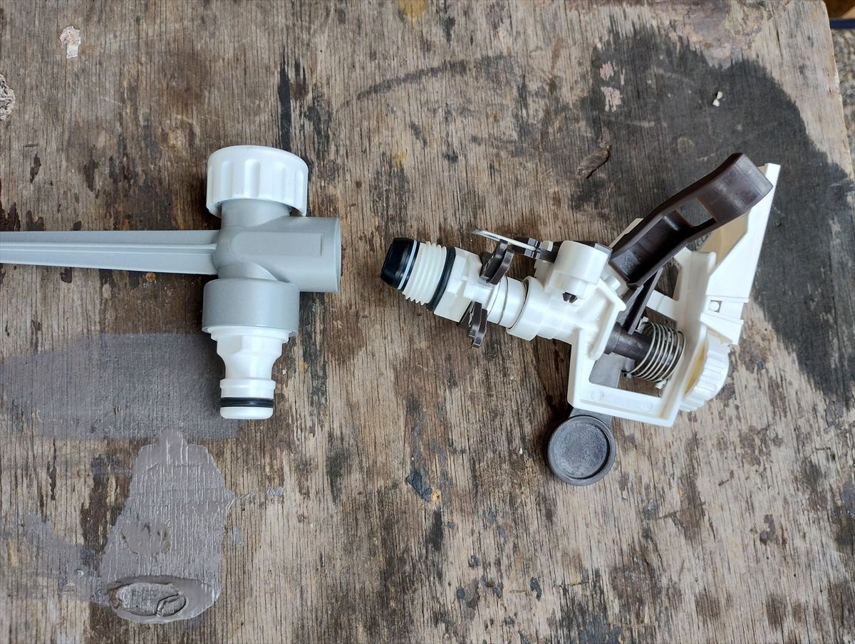 インパクトスプリンクラーはどのメーカーも地面に突き刺して、ホースを横から接続するようになっていますが、我が家では他の植物がじゃまになるので地面から1m位の高さに設置したいので、分解して水道のソケットに接続することにしました。