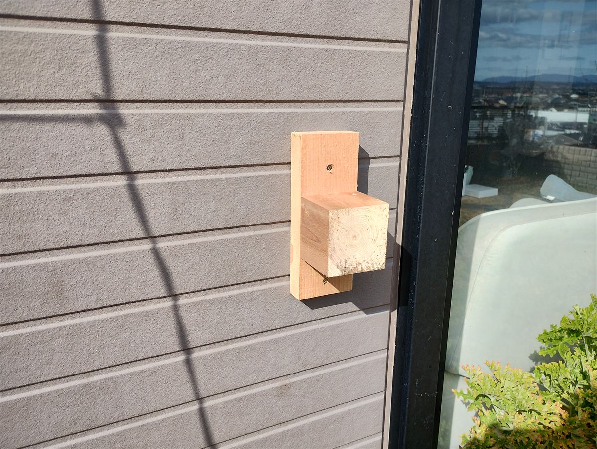 壁に取り付けるのは諦めて、地面に農業用スチールパイプを立て、これにビニールテープで取り付けました。