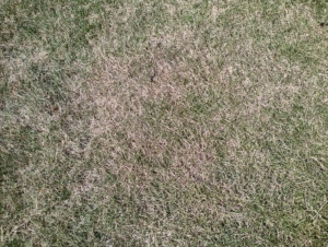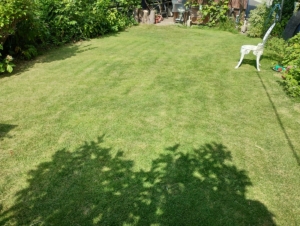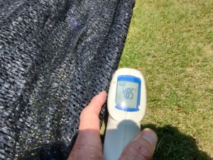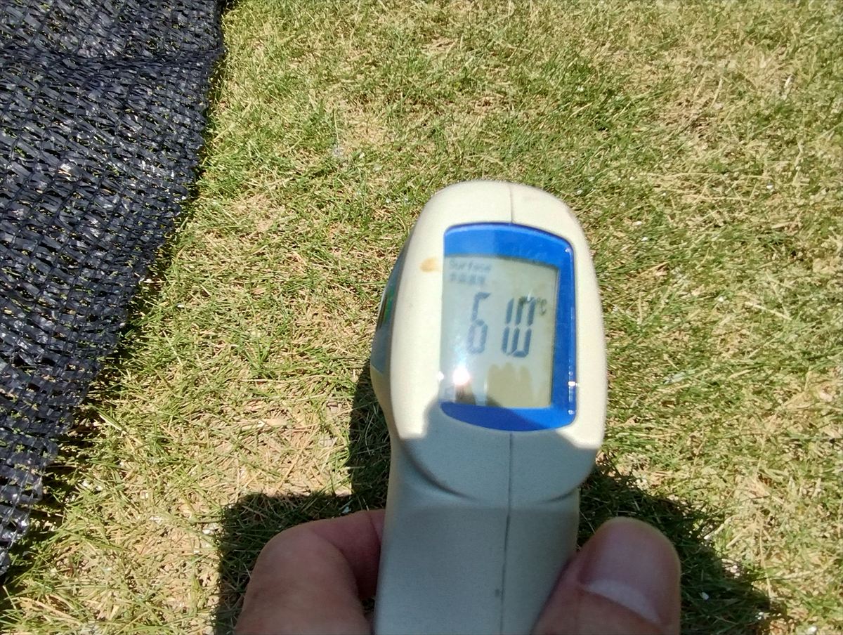 赤外線温度計で芝生面の温度を測ってみると、寒冷紗のないところは61.0℃。