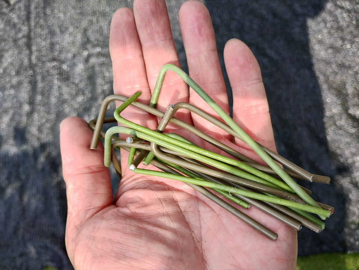丈夫なビニール皮膜付きの針金があったので、10cmくらいに切って先を曲げ、これで寒冷紗を固定しました。