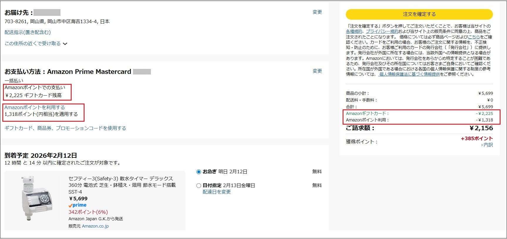 なおこの画面では右側の「このお支払方法を使用」のところではAmazonギフトカードが使用されるように表示されていますが、次の「注文を確定する」ではちゃんとAmazonポイントが使用されるようになっています。