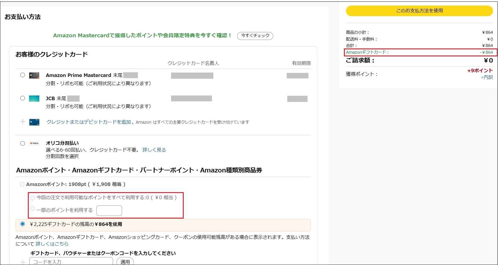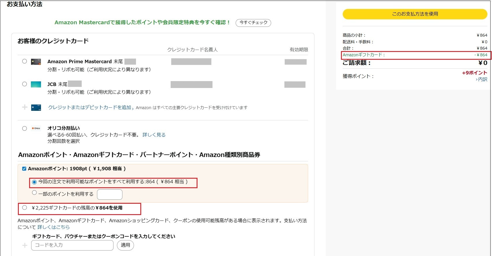 ・ギフトカードとポイントを両方持っている場合はギフトカードが優先されるため、ポイントを使用したい場合は一旦クレジットカードを選択した後ポイントを選択する。