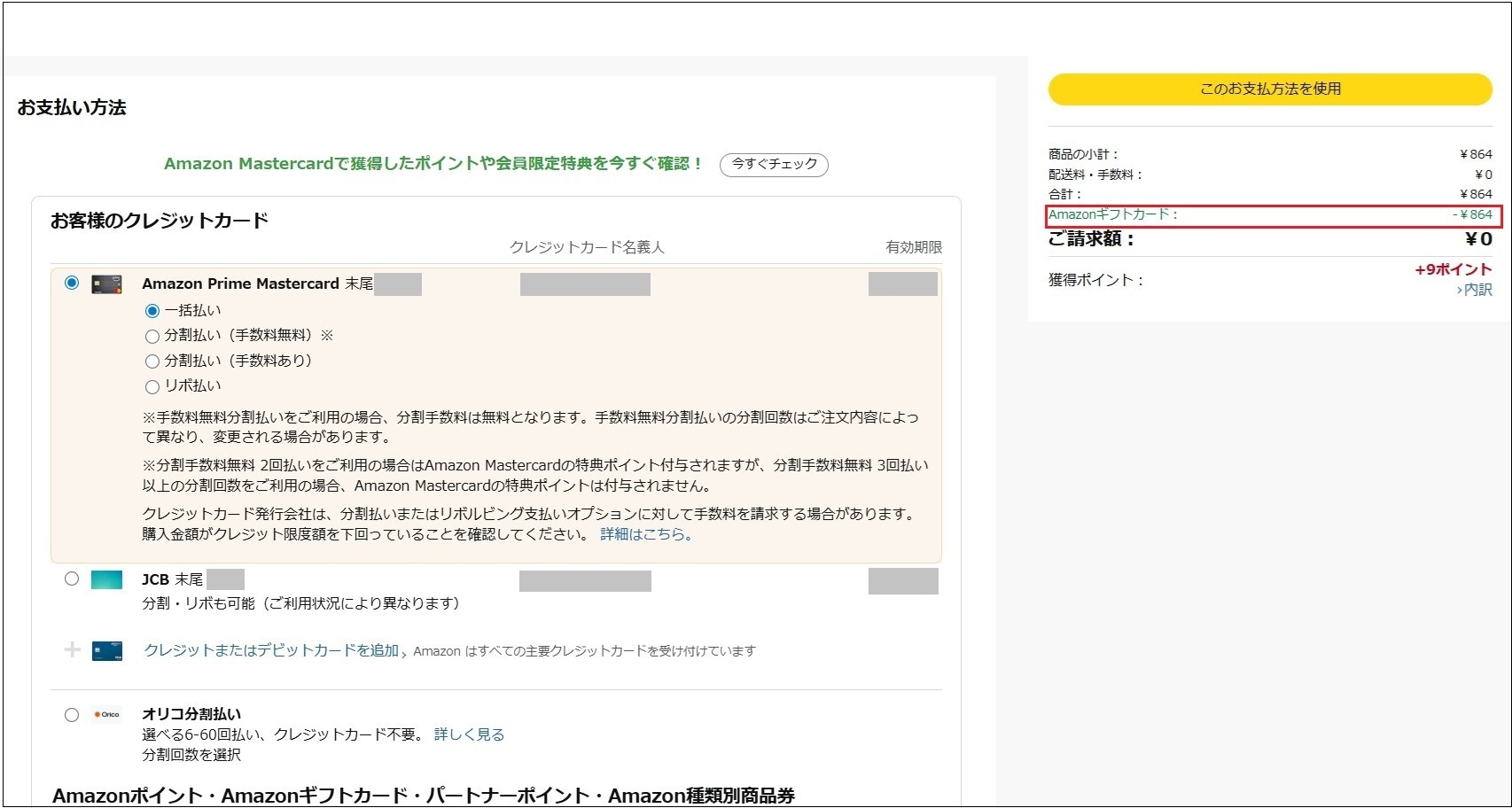 今回もギフトカードが優先され、残りはクレジットカードになっています。