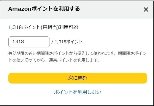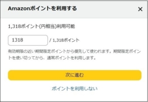 ここで「Amazonポイントを使用する」をクリックすると、「Amazonポイントを利用する」画面が現れ、