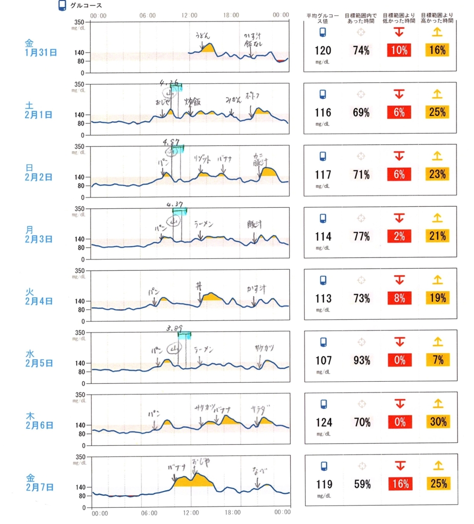 すると1月31日、うどんを食べたら血糖値が200になっている。