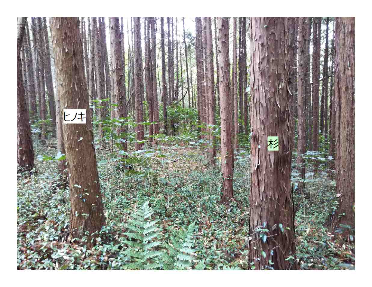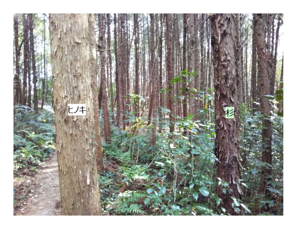 いつも通りがかっているところの写真ですが、写真内に表示しているように杉とヒノキの樹皮が違います。