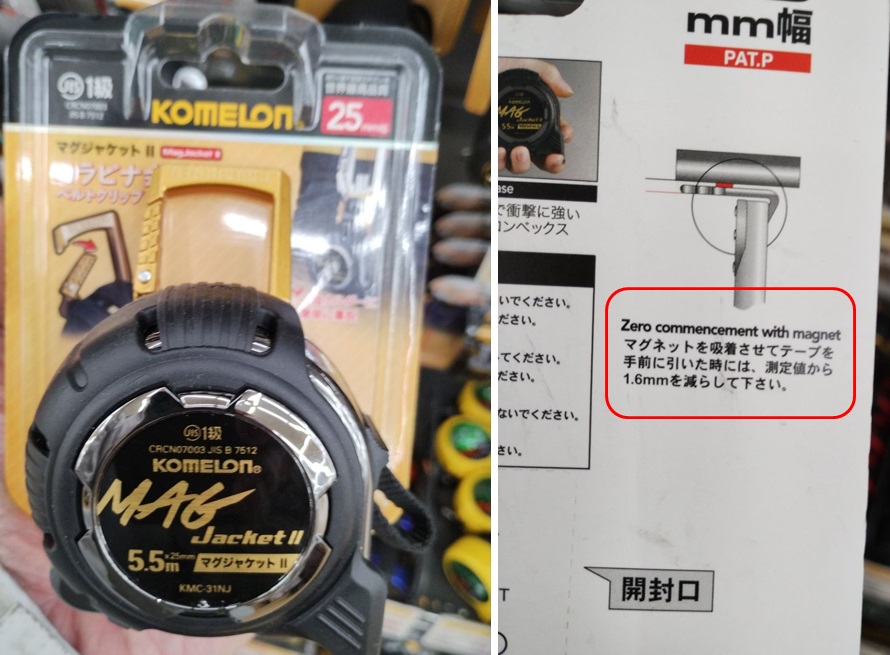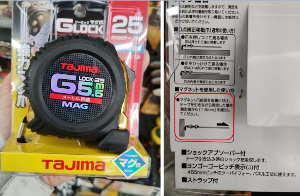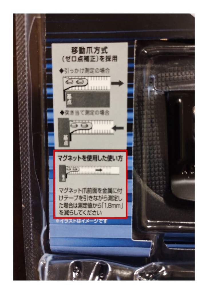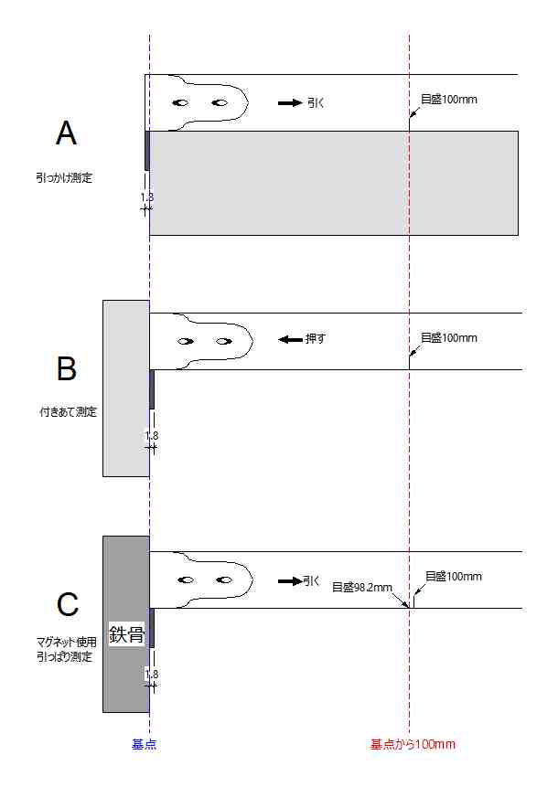 鉄骨など磁石がくっつく材料に爪を当て、上図のBの状態からCのようにメジャーを引っ張るのだから、メジャーの目盛は本当の寸法より1.8mm少ない位置を示すはずです。