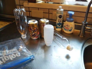 これはペットボトルや空き缶などを捨てる前に乾燥させているところです。