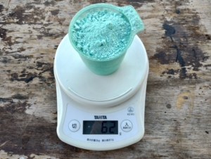 となるとZボルドーのような粉の水和剤を量るときは秤で量ったほうがやりやすいし、液体の農薬は秤ではなくカップのような容器で体積を測ったほうがやりやすいです。