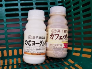 スーパーで見つけた高千穂牧場の「飲むヨーグルト」と「カフェ・オ・レ」。