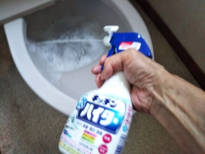 ただこれで擦っても効き目はないので、朝仕事に出る前と夜寝る前にトイレの内壁に噴射して、しばらくカビに接触させておく。