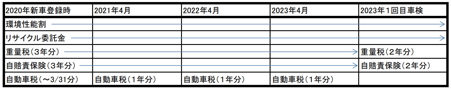 重量税と自賠責保険は新車時に3年分支払い、その後は車検ごとに2年分支払う。