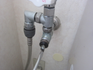 2階への止水栓を開け、水漏れがないことを確認して、トイレの止水栓を全開にします。