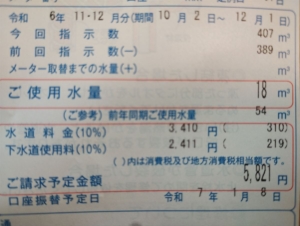 という具合に節水対策をしているので、検針の結果次のように使用水道量が54㎥から1/3の18㎥になったのでした。