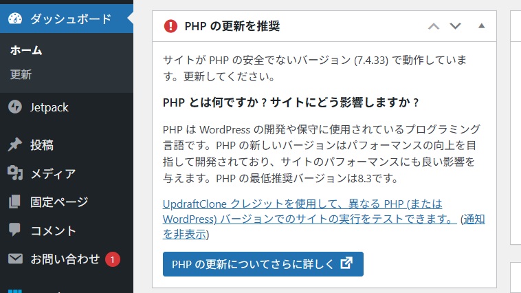当サイトのWordPressとPHPは何年もバージョンアップしていなくて、警告が出ています。