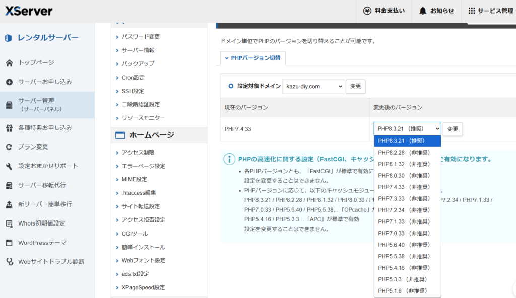 そしてエックスサーバーの管理画面にログインしPHPの切替を行いました。