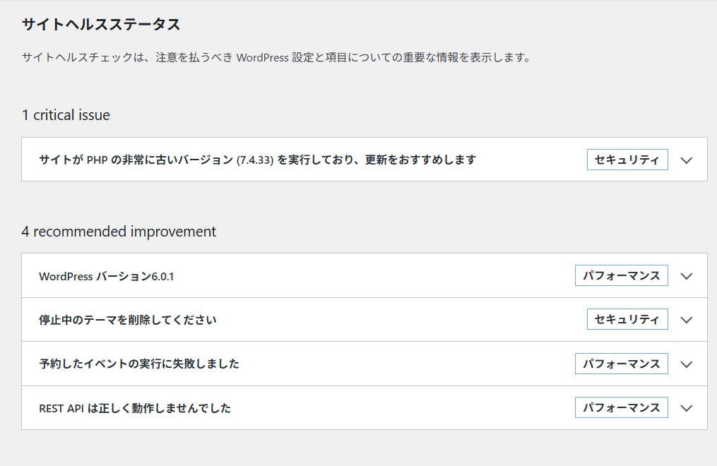 現在の構成(WordPress 6.0.1 / PHP 7.4.33)は、どちらもサポートが終了しているか、推奨環境から外れています。特にPHPのバージョンが古いことが、WordPress本体の更新を妨げている主な要因です。
