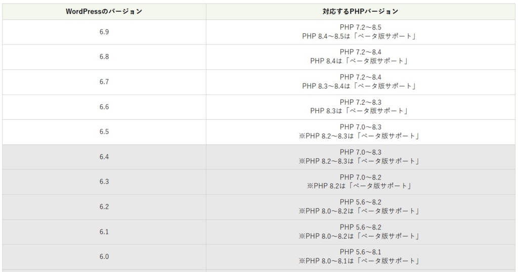 tane CREATIVE株式会社に「WordPressのバージョンと対応するPHPバージョン」の表がありました。