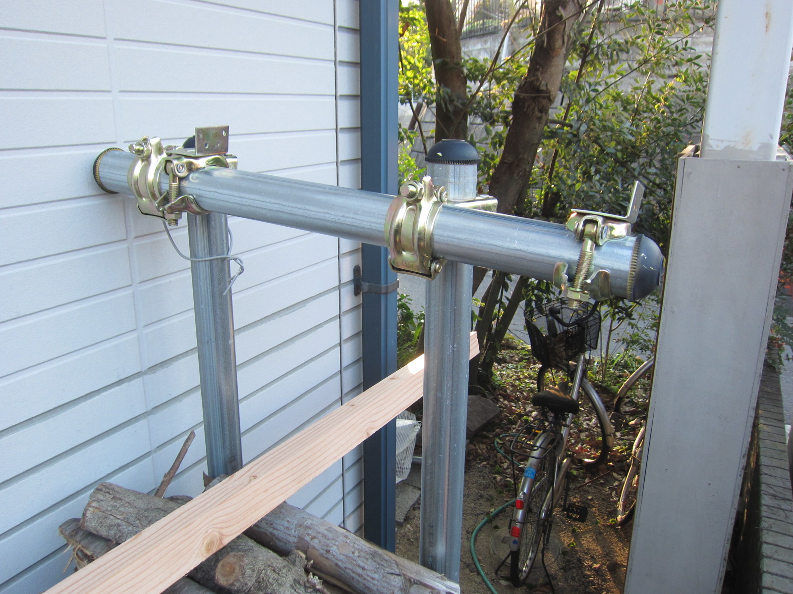 そして、少し長めの単管パイプを自在ジョイントという金具で斜めに固定します。