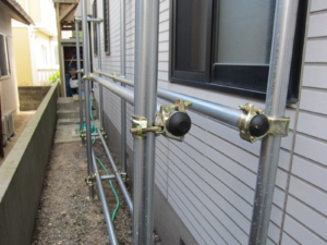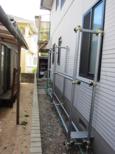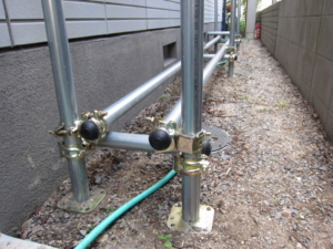 固定ベースを地面に置き、縦の単管パイプを壁に立てかけながら組み上げていきます。