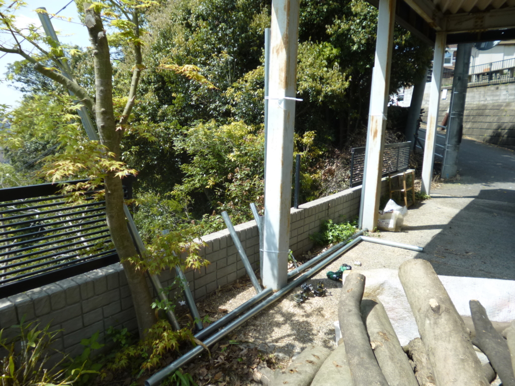 第2の薪置き場をブロック塀の上に単管パイプで作りました。