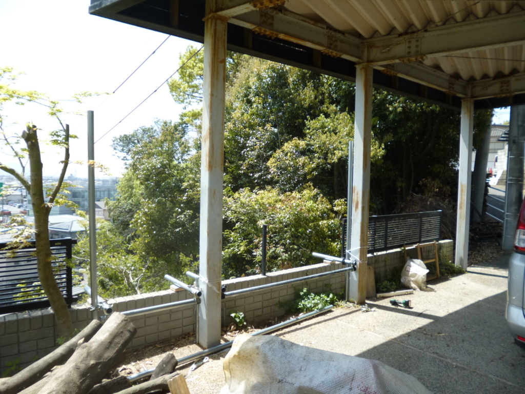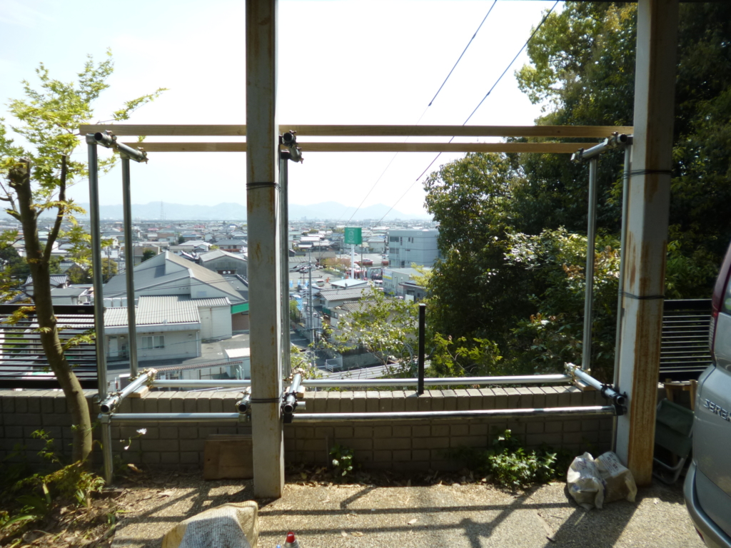 まず縦の単管パイプを立てガレージの支柱に仮止めします。