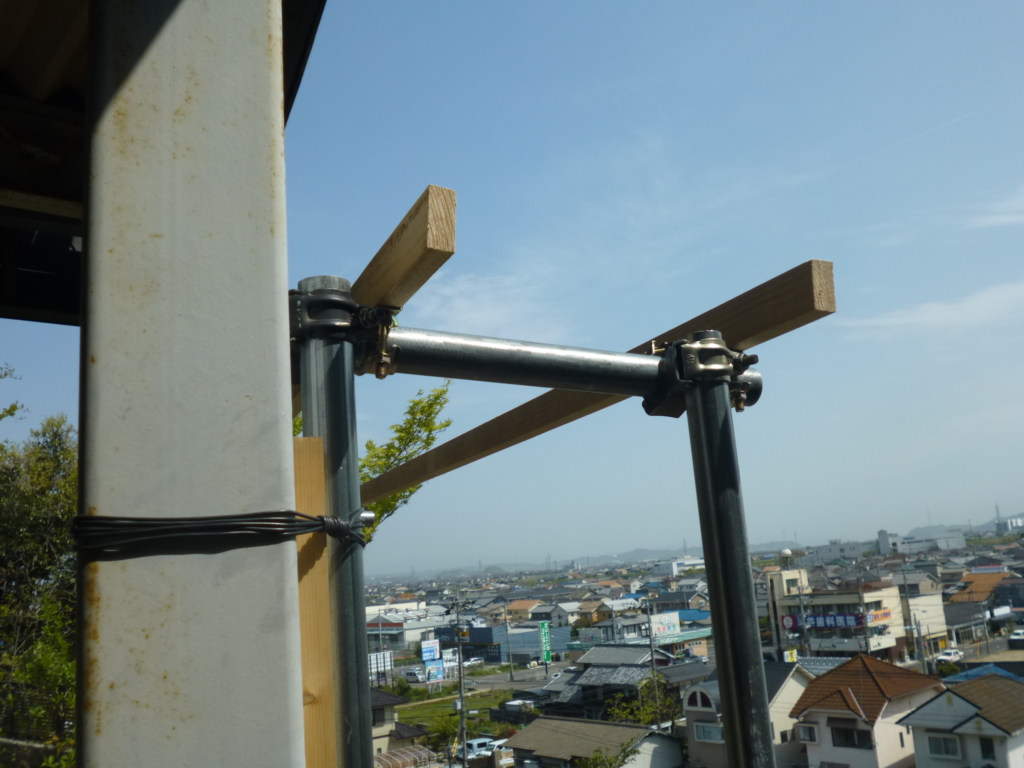 手前の縦の単管パイプはガレージの支柱に固定するため、木の板をスペーサーとし針金できつく縛ります。