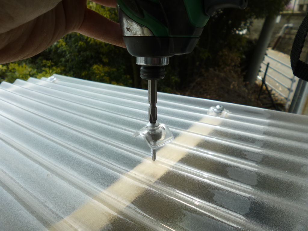 ポリカには太陽面の指定があるのでそれに注意しながら専用のビスで固定します。