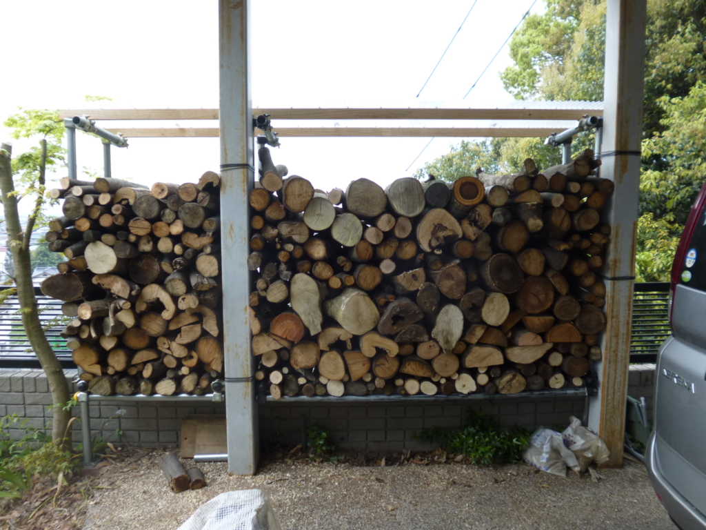長さ70cm程の薪は置くことができるので、ここで1年間乾燥させて後で切断・薪割をします。
