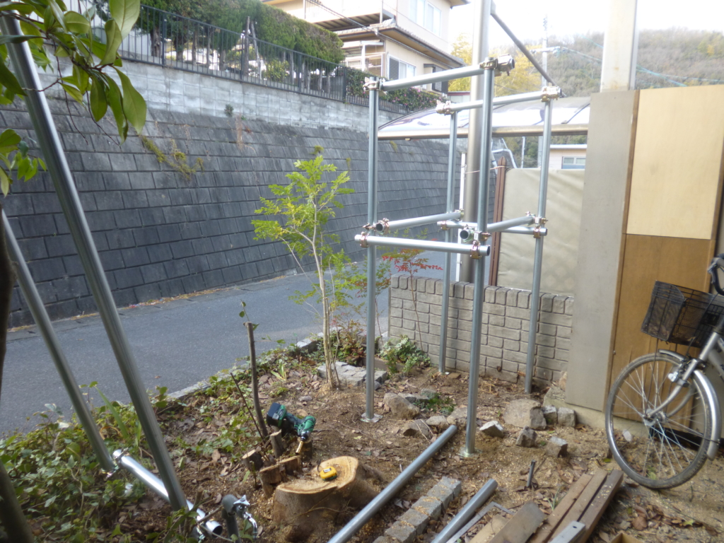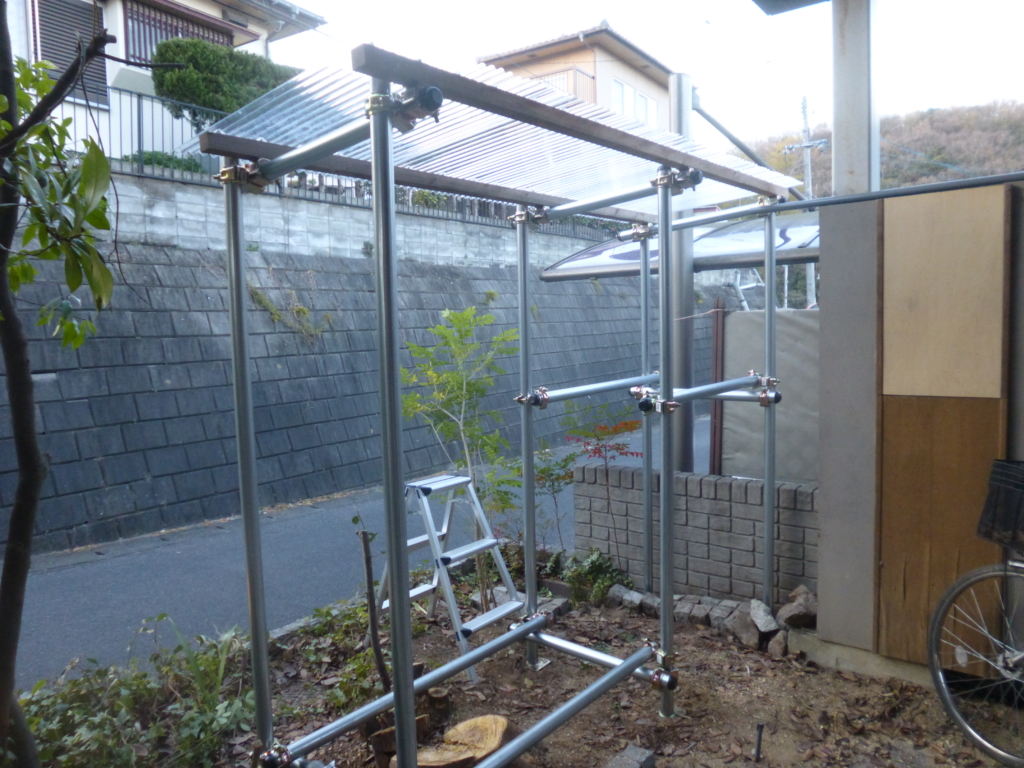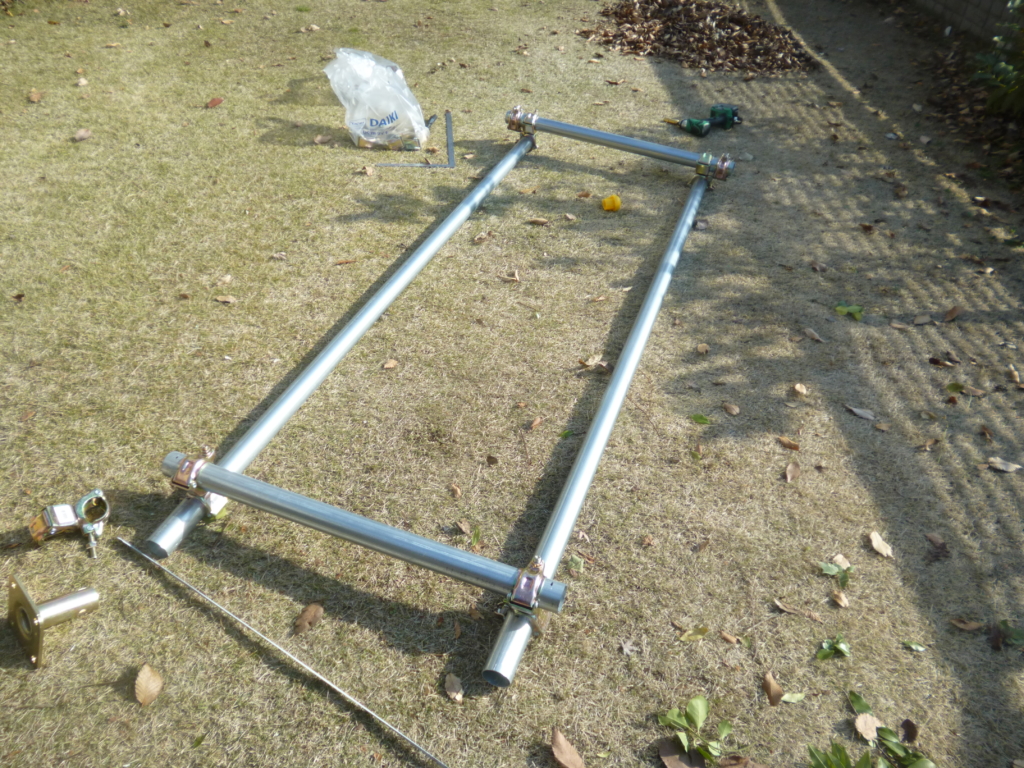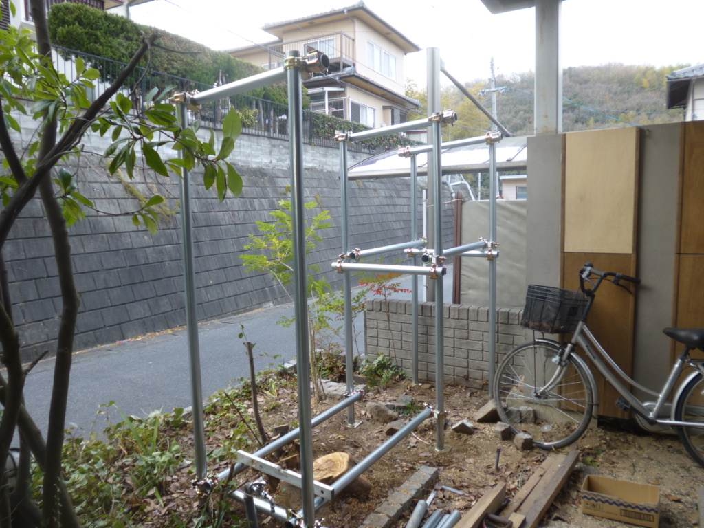 最後の四角形を横の単管パイプで繋ぎ固定します。