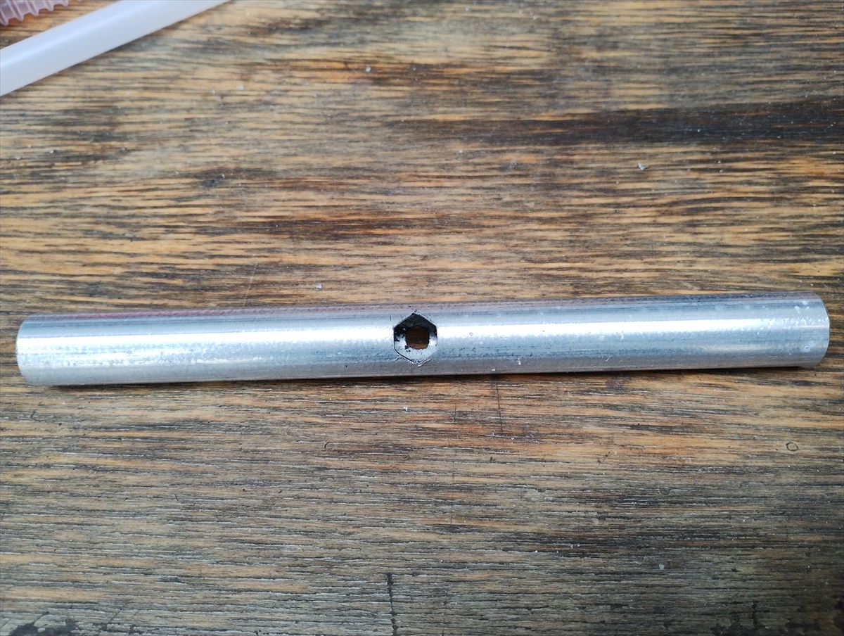 これを受けるメス側は高ナットをそのまま使いますが、シャフトが入る部分(長さ20mm)は先ほどと同じように穴を5.7mmに拡張しておきます。